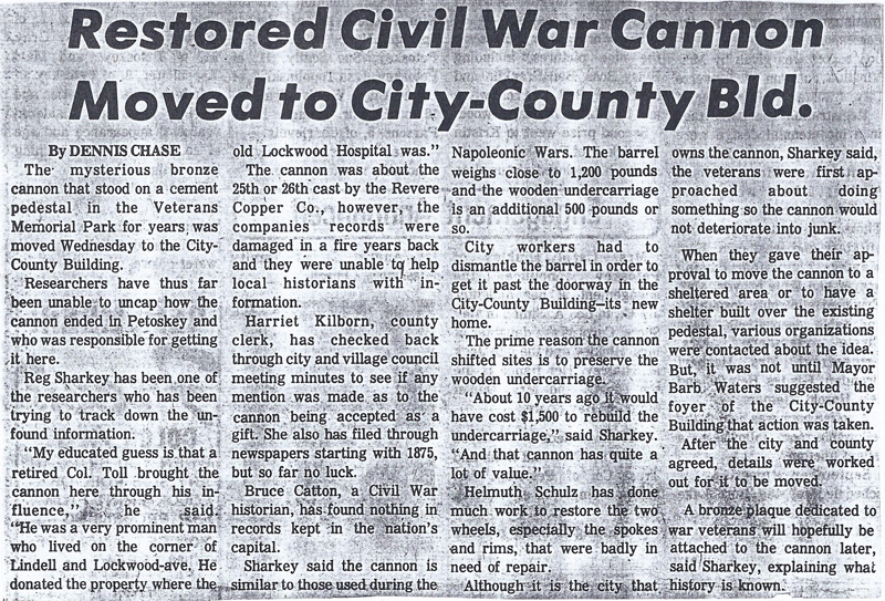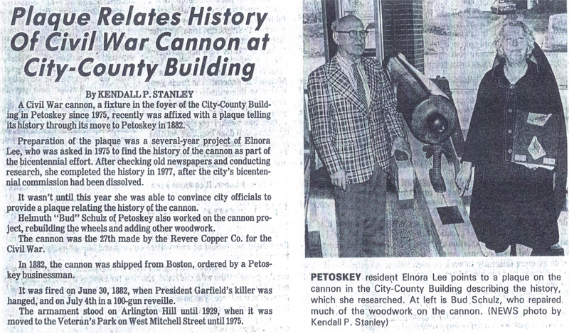 Petoskey News Review Cannon Roared at Hanging of Garfield's Killer Editor's note: In March of 1975, Reg Sharkey asked Mrs. Idena Clark at Petoskey Friendship Center for help in learning the history of Petoskey's wheel mounted Civil War cannon Mrs. Elnora Lee was asked to do the task, and the result follows: After months of researching, the 11/2 inch fine printed paragraph, in a newspaper column equal to today's tea table, tells of the arrival in Petoskey of our No. 27 Civil War Cannon. Much more space was given to the building of the Arlington Hotel, the Rosenthal block, the G.R. & I Railroad depot and the hanging of Charles J. Guiteau. The first regular train run to Mackinaw City was a week later. The Petoskey businessmen joined together and ordered a 1200 pound cannon from Boston. It arrived June 26, 1882 by freight train and was unloaded the next morning. It was in time for the grand 4th of July celebration, when it was to " wake and call us early" with a 100 gun reveille at sun-rise-a custom to prevail on the 4th for some years. It could speak out when the weather was too inclement for parades or speeches, as on July 4, 1884, when "the cannon boomed hour after hour from the high bluff and echoed in the fog over the bay." But the first time our "No. 27" spoke in Petoskey was to herald justice on June 30, 1882 when Charles J. Guiteau was hanged in Washington D.C. The year before he had shot President Garfield. The country was glad that justice had been meted out. Now Petoskey had a loud voice to join in that proclamation. The next year, August 11, 1883, the Lombard Post No. 170 of the Grand Army of the Republic (G.A.R.) was organized in Petoskey with 58 members. Several state officials were in town for the event. The "big gun" spoke again when J.W. Chilson fired the salute at 1 p.m. Mr. J. S. Coffman was one of the gun's owners. We can well believe that it has been fired on many occasions, but it could not have been popular with the newspaper of the era, as there is so little mention of it through the years. Tradition reveals that paths lead one up the valley to old City Park, which became the city Zoo and later, Winter Sports Park. The north hill, about a block west of the north end of Bay View-Ave. was known as Flag Pole Hill in the Park. Here was a flagpole and "No. 27" looking over the top of the hill out onto the bay, as if guarding the city of attack by sea. John Deschermeier visited the zoo and cannon many times as a lad, and recalls that the cannon was still there in 1928. After that, it was stored with its other tube until the Veterans Park was created in 1942. There, in wartime and until 1976, it reminded motorists, that America had given her men to defend our precious country. The local Bicentennial Commission desired in 1975 that the deterioration oak wheels should be preserved. The wheels were removed and worked on for some months by Helmuth Schulz. Just before July 4, 1976 the cannon and wheels were mounted in the foyer of the City-County Building on Division at Lake Streets, and its days of fighting the elements were ended. This cannon — No. 27 — was likely the 27th one made for the first order of 30 cannons that James Ripley, Brigadier General, Chief of Ordinance asked, Nov. 14, 1861, that Revere Copper Company Of Boston, Mass., to manufacture. The tone of the orders show the urgent need for artillery by the North in the first years of the Civil War. From the Revere Company about 343 were ordered within two years, plus orders to other companies. Chief Ripley begged for an output of five cannons per week. The cannon's war history not surfaced, as from which battlefield it spoke out for victory and unity or under which general it served. But as it was shipped from Boston and was of the first order, it likely stayed in the north eastern part of the country. We will comprehend its unutterable history by general written accounts of bravery, courage and endurance in those terrible years left of the Civil War that ended with a united country; a war that veterans speaking of each others as "Comrades" and striving to meet at annual encampments. Pride and certainty of home and country was their reward for the suffering and privation that this cannon has witnessed. (Researched and compiled by Mrs. Leonard (Elnora) Lee, with appreciation to Peggy Blount at museum library for missing clue.)